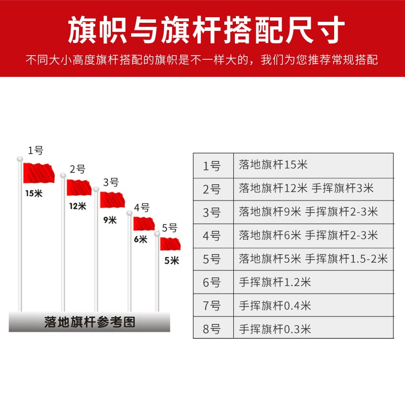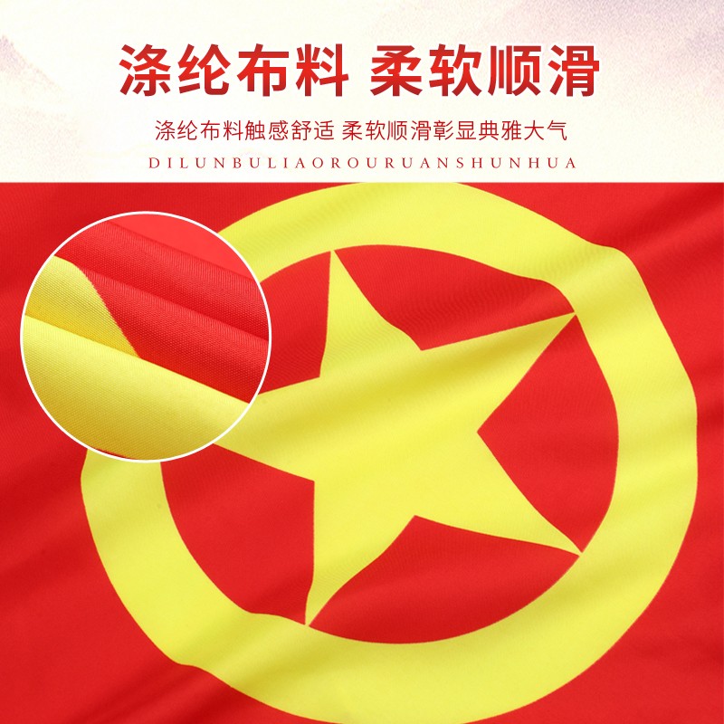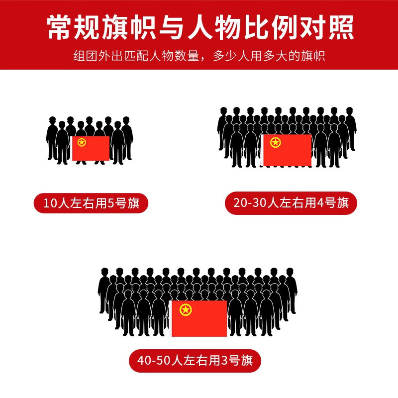 规格: 1号团旗(192*288cm) 2号团旗(160*240cm) 3号团旗(128*192) 4号团旗(96*144cm) 5号团旗(64*96cm)